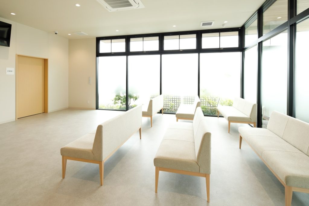 待合室: 柔らかな自然光を取り込みつつ外部からの視線を遮断し、安心感のある空間を創出