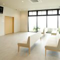 待合室: 柔らかな自然光を取り込みつつ外部からの視線を遮断し、安心感のある空間を創出
